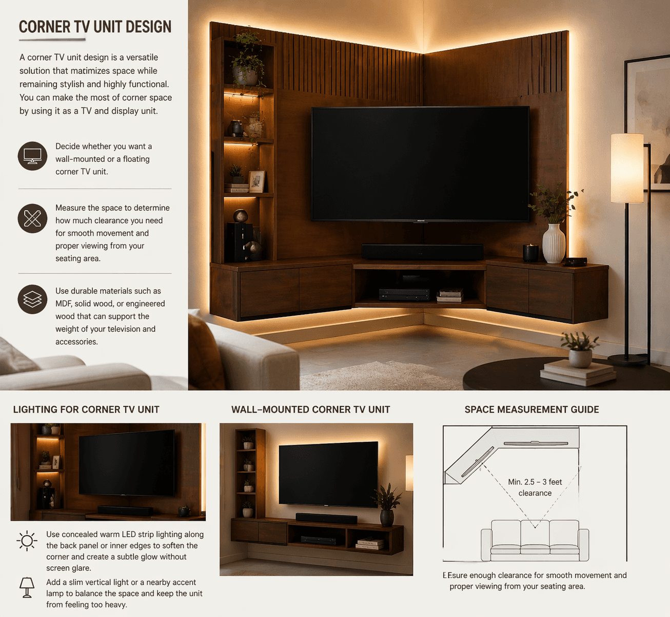 Decide whether you want a wall-mounted or a floating corner TV unit. Next, measure the space to determine how much clearance you need for smooth movement and proper viewing from your seating area. Use durable materials such as MDF, solid wood, or engineered wood that can support the weight of your television and accessories.