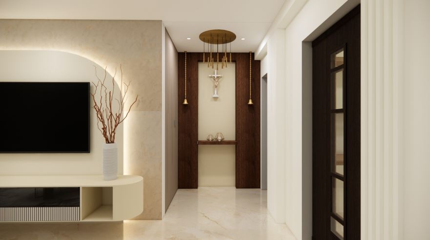 The pooja room follows a functional contemporary approach, aligning with the overall minimal and cohesive theme of the home.