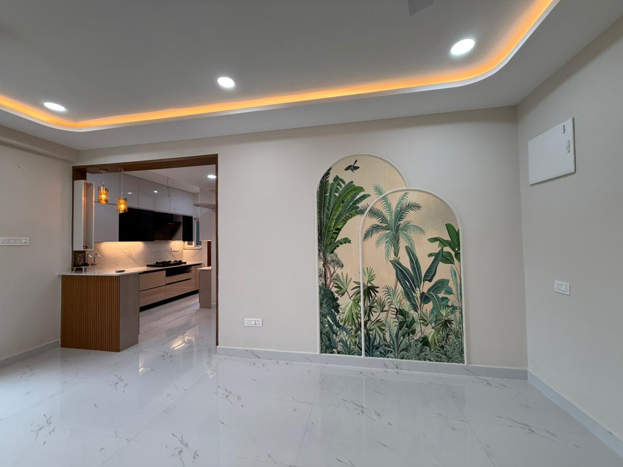 The living room incorporates tropical-themed wallpaper and textured paint, combined with furniture planning that supports the overall design direction. A grand pooja unit is integrated within the space.