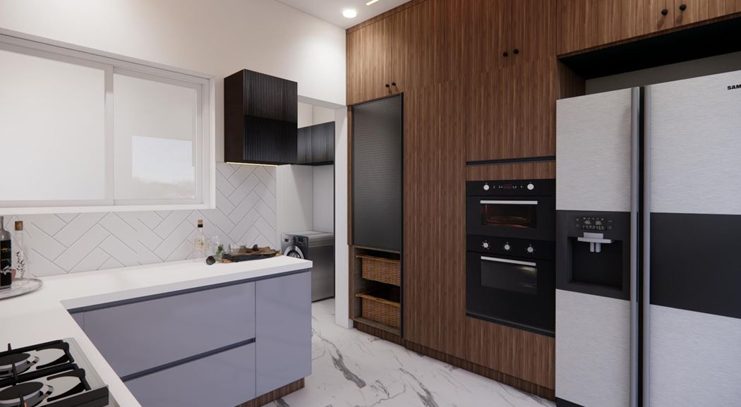 Material Direction : Neutral tones with fluted panels and marble/ quartz finishes.