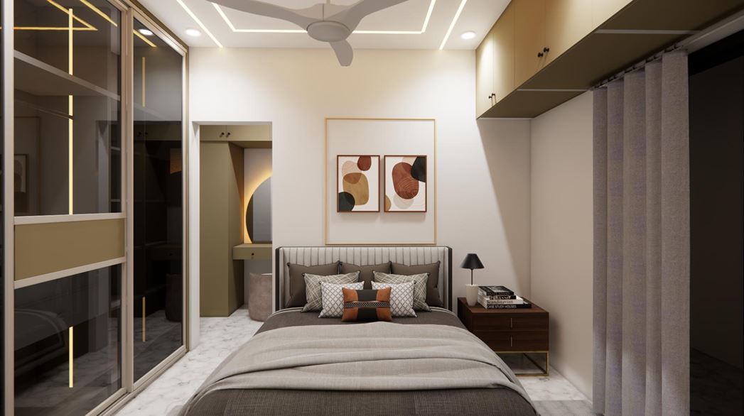 The master bedroom includes a wardrobe which has custom-made sandwiched glass shutters with rattan elements, introducing material layering within the design.