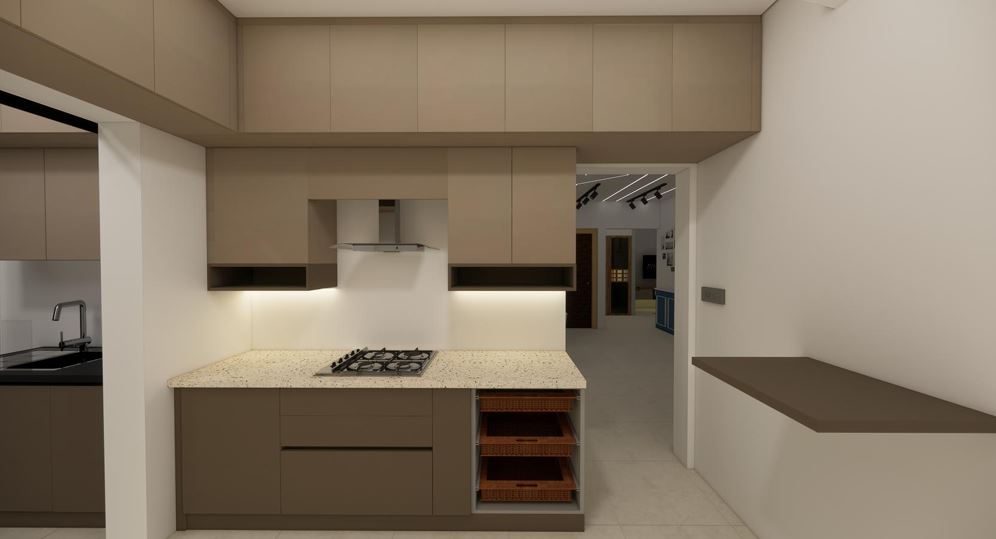 The kitchen is designed as a modular setup with efficient planning, including overhead and base cabinets, a built-in hob, and a chimney provision.