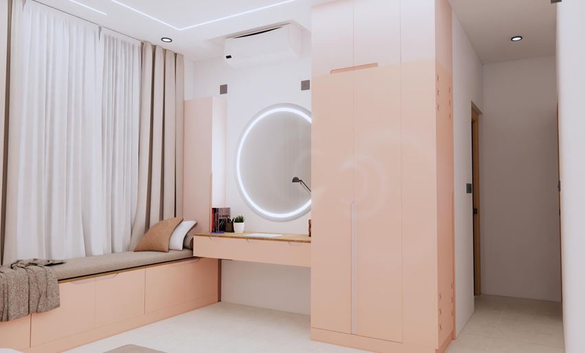 The daughter’s bedroom features a customized wardrobe and a study, with soft tones. The guest bedroom is kept simple with minimal paneling and functional storage.