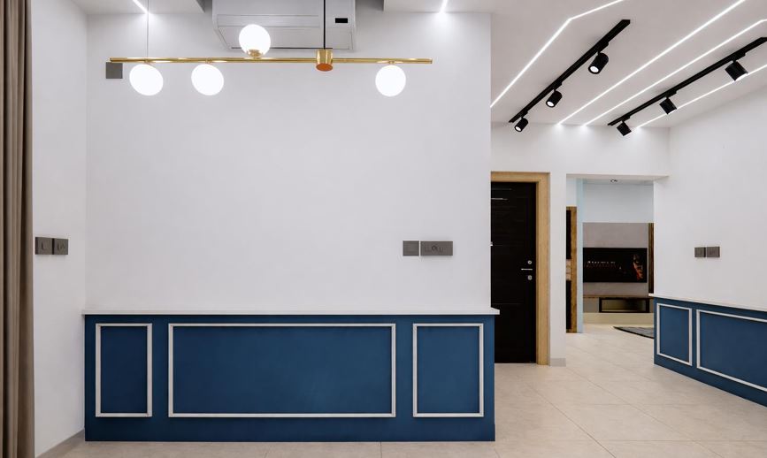 Feature panel wall with layered ceiling lighting.