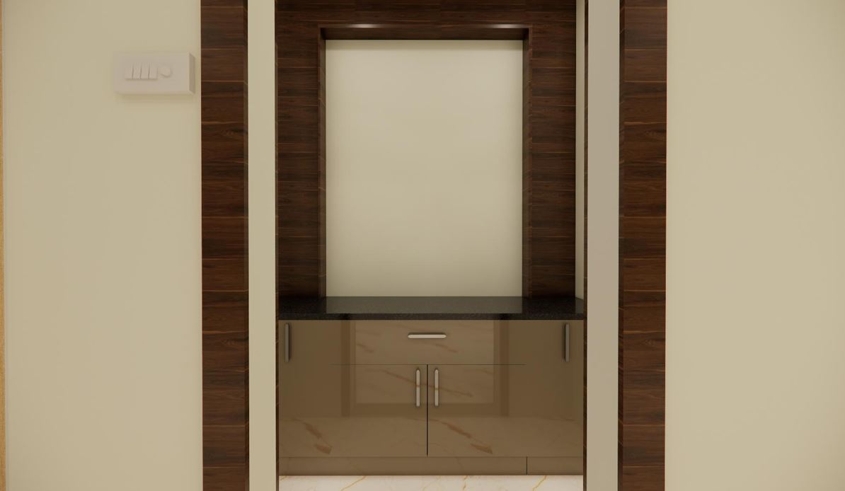 The pooja room follows a functional contemporary approach, aligned with the overall minimal theme of the apartment.