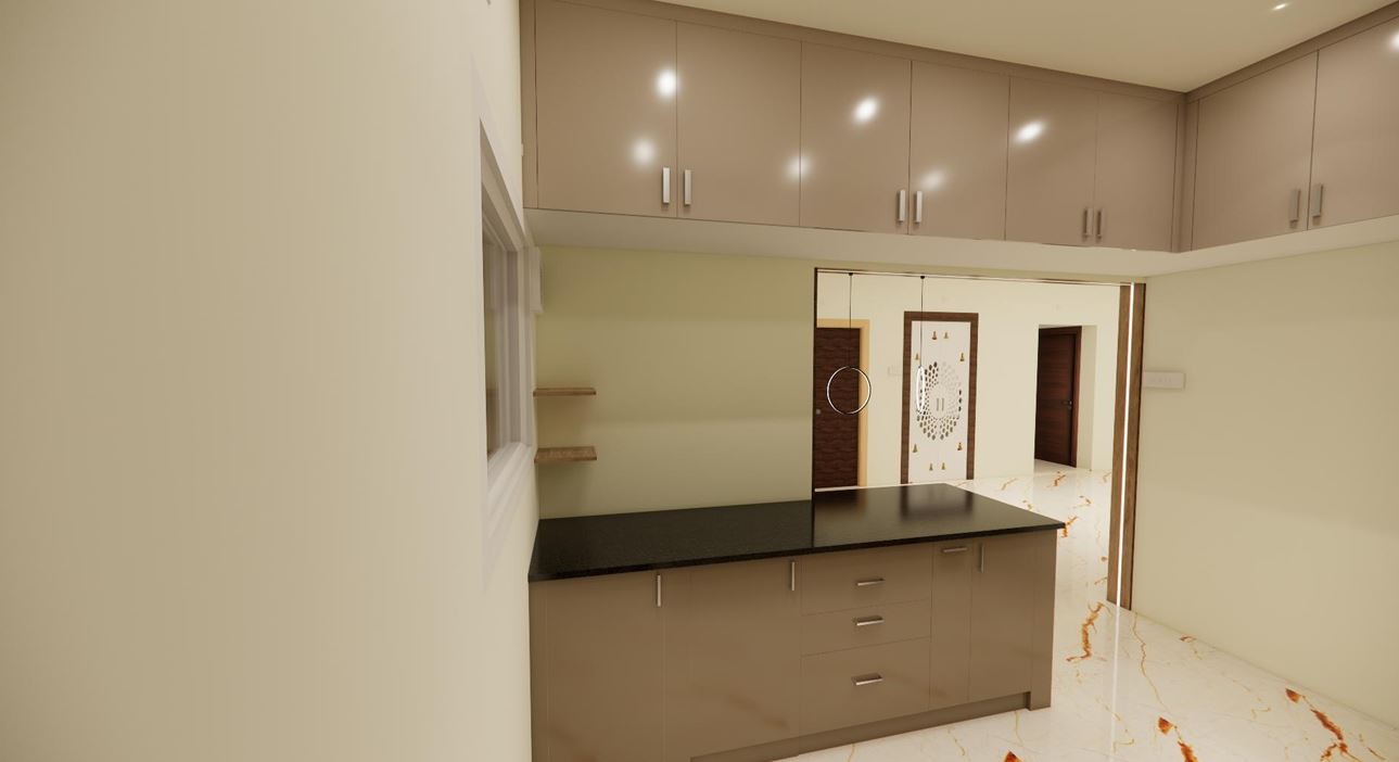 The kitchen follows a functional modern contemporary layout. A key challenge was accommodating the oil pullout unit within the limited civil wall space.